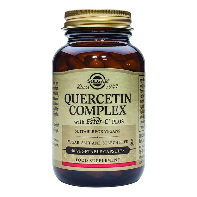 Solgar Quercetin Complex with Ester-C Plus is a dietary supplement that combines the important bioflavonoid Quercetin with Ester-C and Bromelain. It supports immune health and provides antioxidant properties. The formula is gentle on the stomach and suitable for vegans, vegetarians, and those who are gluten-free and dairy-free.