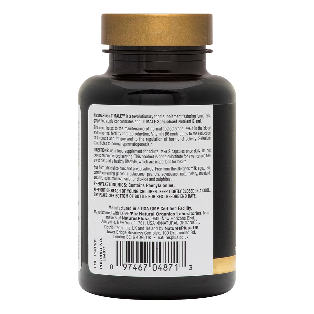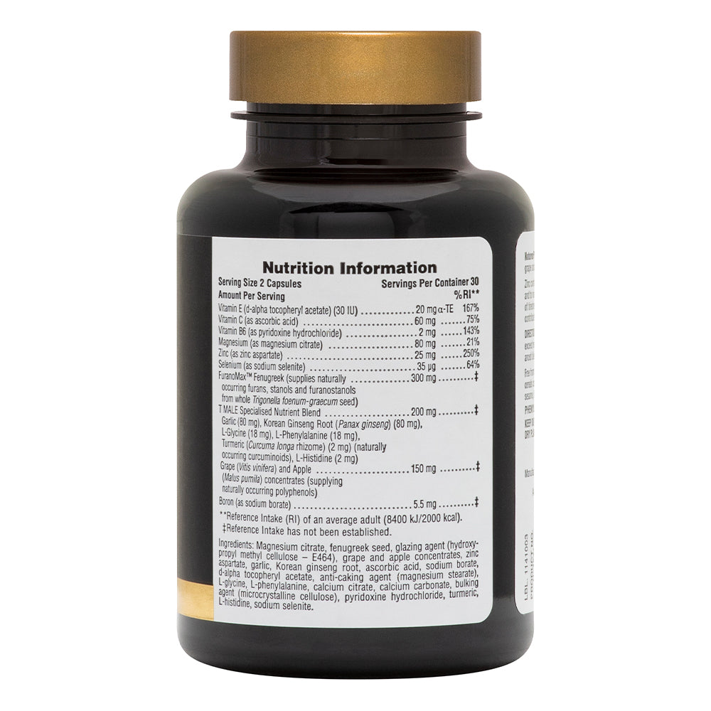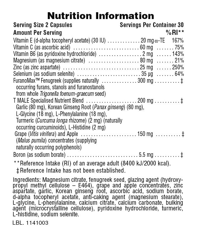 A revolutionary food supplement featuring fenugreek, grape and apple concentrates, and T MALE Specialised Nutrient Blend. High-potency zinc contributes to the maintenance of normal testosterone levels in the blood. Zinc also supports normal fertility and reproduction, while vitamin B6 reduces tiredness and fatigue and aids in the regulation of hormonal activity. T MALE also provides men with selenium, which offers nutritional support for normal spermatogenesis.