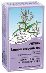 Organic lemon verbena herbal tea, suitable for vegetarians and vegans, naturally free of gluten.